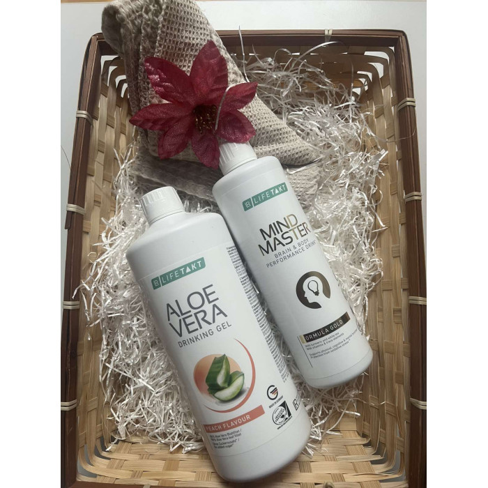 Празнична кутия Здраве-Алое вера гел с праскова и за диабетици, Минд Мастър с куркума, кухненска кърпа 100% чист лен